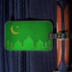 Elegant islamic-illustration: guldmoské med måne och stjärna på grungy grönt.