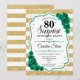 Överraskande 80 Födelsedagsfest inbjudan. Feminine emerald grönt design med faux glitter guld. Innehåller vitt och guld rand, ro, skriptteckensnitt och konfekti. Perfekt för en elegants damdag i firande. Kan vara personlig att visa vilken ålder som helst. Skrivna Zazzle-inbjudningar eller digital utskrivbar mall för omedelbar nedladdning.