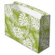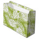 En enkel, stor presentsäck med en upprepande mönster av stort handflatan lämnar på oliv grönt grund. Trendiget är modernt och tropiskt.