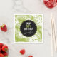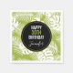 Party-blöjor med ett upprepande mönster av stora löv i handflatan på oliv grönt grund. En svart cirkel med ett guld gräns överst med information om din personlig födelsedag inuti.