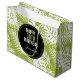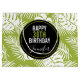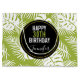 Personligens födelsedagspressar (stora storleka) med en upprepad mönster av stora handflatan-löv på oliv grönt bakgrund. Trendiget är modernt och tropiskt. En svart cirkel med en inre gräns i guld överst med information om personligen inuti.