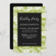 En födelsedagsinbjudan med ett upprepande mönster av stort handflatan löv på oliv grönt grund. Ett svart ram med en guld färgad gräns överst med personligen inuti. Trendig och elegant.