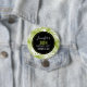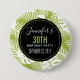 En födelsedagsknapp med en upprepande mönster av stort handflatan löv på oliv grönt bakgrund. Trendiget är modernt och tropiskt. En svart cirkel med en inre gräns i guld överst med information om personligen inuti.