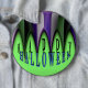 Halloween-design med lila och grönt- och randiga bågar som ser ut som tjusiga tänder på en lätt baksida.