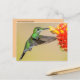 Vykort med en strålande, strålande hummelfågel med grönt och grönt med lysande fjädrar matande från en orange- och gult-blomma bredvid ett bin. Vackert kort för hummingbird, natur och trädgårdsälskare. Foto taget vid Bosque de Paz Reserva Biologica, Valle del Rio Toro, Alajuela, Costa Rica.