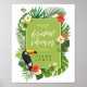 Välkomstskylt för färgstark möhippa med vår grönt ram som gränsar till ett fet tukanskt sitta mellan högfärgsblommor och handflatan löv. Den vita bakgrunden är valfri och kan ändras om du vill. Denna utformning av tropiska poster är perfekt för sommar, strand och tropiskt bröllop, födelsedagar och andra speciella evenemang. Sök i ID577 för att se matchande produkter.