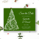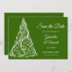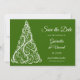 Ange en festlig ton för dina kommande decemberpåhopp med elegant Grönt Julgran Winter Wedding Spara datum meddelande. Den här behållan för vinterceremoni och mottagning i anpassningsbar i giftermål har en komplicerad utformning av det vita julafton träd på gröntens bakgrund. Finns som en utskriven inbjudan att skicka eller som en digital nedladdning för att enkelt kunna dela digitalt online.