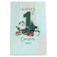Välkomna vattenfärgsillustration för att fira baby:s allra första jul. En djärv grönt "1:a" går i centrum med "julen" elegant skriven under. Ett vackert grönt-tonat Jultomten och snögubbe följer med ett festligt Julgran och glada gåvor som skapar en hjärtlig och viskfull helgdag. Ett mysigt, spännande biet av konst som utstrålar julstämningen.