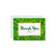 Ett tackkort, med en bra vårtidskonstruktion som visar sig utanför fält i klöver lämnar i en lush naturlig grönt. Tack för att du skrev ett trendig i mitten på ett vitt ram med en FAUX guld-folie gräns. Kortets baksida har en svag ljust grönt svängande marmorerad struktur.