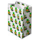 En söt hand plockade leprechaun gnome som håller en schak med en pocka av guld St patrick's day presentväska.