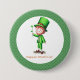 Knappen Cute för Saint patrick's day med en leprechaun i grönten kostym. Bakgrunden är grönt med ett mönster av vitt polka dots. Du kan anpassa texten med din egen formulering. Klicka på Anpassa ytterligare om du vill ändra teckensnittet, dess storleka eller färg. Fler produkter med den här illustrationen finns i min butik. Illustrerad och designad av Patricia Alvarez.