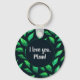 Nyckelkedjan kärlek Mors dag med en mörk botaniskt mönster skapat från ett blandat medium bläck och en digital målning av abstrakt Mamma grönt med löven vener över ljust grönt, nästan svart, bakgrund. Den här lättvindiga nyckelkedjan för naturen älskare mamma innehåller anpassadet "I kärlek you, mamma".