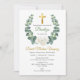 Märk religiösans ögonblick av baptism med denna elegant inbjudan. Med en vattenfärgad utandning med grönt löv och söt guld kor, anger inbjudan perfekten vid ditt särskilda tillfälle. Celebra el momento religioso del bautismo con esta elegante invitación. Adornada con una corona en acuarela con hojas verdes y una bonita Cruz dorada, esta invitación establece el tono perfeecto para tu ocasión especial.