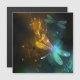 Flygning av glödande, grönt, artificiellt ritad drakflygning med genomskinlig grönt och gult vingar på ljusande nattbakgrund med träskväxter och eldflugor. Glowing Dronfly.