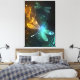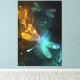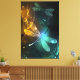 Flygning av glödande, grönt, artificiellt ritad drakflygning med genomskinlig grönt och gult vingar på ljusande nattbakgrund med träskväxter och eldflugor. Glowing Dronfly.