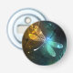 Flygning av glödande, grönt, artificiellt ritad drakflygning med genomskinlig grönt och gult vingar på ljusande nattbakgrund med träskväxter och eldflugor. Glowing Dronfly.