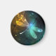 Flygning av glödande, grönt, artificiellt ritad drakflygning med genomskinlig grönt och gult vingar på ljusande nattbakgrund med träskväxter och eldflugor. Glowing Dronfly.