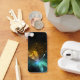 Flygning av glödande, grönt, artificiellt ritad drakflygning med genomskinlig grönt och gult vingar på ljusande nattbakgrund med träskväxter och eldflugor. Glowing Dronfly.