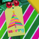 En färgfull geometrisk, ljusstrimmig Julgran på en ljus grönt bakgrund gör en märkre av en gåva av helgdag. Modern. Fet. Bright och Merry. Denna märkre av julklapp blandar i roligt traditioner med modern maximalism. Ett unikt vibrerande stil för din jul- och Helgdag-gåva med nyanser av rosa, orange, grönt, rött, gult och turkos. Samordna presentfigursättning som finns i vår samling.