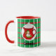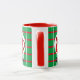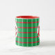 Vare sig du själv har hett choklad, kaffe eller te är det här helgdag mugg till dig. Grönten har en bakgrund med rött och vitt linjer som bildar mönster på fyrkanter. På mugg från och tillbaka finns det en bild av en mugg av hett choklad.