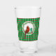 Glaset har en grönt med rött och vitt linjer som bildar en mönster av fyrkanter. I mitten finns en vit cirkel med en evergreen-andedräkt och kardinal.