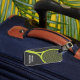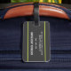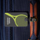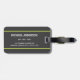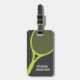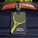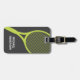 Bagagemärkre som diagonalt presenterar ett grönt tennisracket över en mörk - grå bakgrund. Anpassadenamn och efternamn på bekläda, och information om namn och om kontakt på baksidaen. Underbar gåva för en tennisspelare eller en tennislagledare.