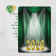 Guld 2025-texten i strålkastarljuset med grönt-scenridån för 2024-studentfestens inbjudan.