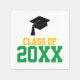 Dekorera party bord med Grönt- och Guld-klass 2024 Studentfest Napkin. Anpassa med student-klassåret. Den har "Klass 20xx" i guld och grönt med en svart hylsa.