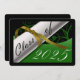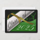 Grönt och guld studenten-kort med ett examensbevis och studenten-år. Baksidan är en svart bakgrund med guld-bokstäver för annonserna i studenten.