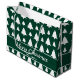 Desteis ursprungliga mönster av ren vit julfir träd silhuettes på gröntens bakgrund färg. Det finns också ett anpassningsbara textområde för en namn eller annan anpassningsbar.