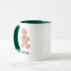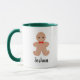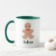 mugg har en bild av en söt gingerbrödspojke som bär en röd bukslin och dekorativa pepparmint-godis. Gingerbrödspojken har något mörkare kant till ge, som om den såg färsk ut ur ugnen. Brans isbildningsdetaljer utgör hans jacka och byxor. Anpassa mugg genom att lägga till ett namn eller ett meddelande.