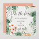Ett modernt och vackert spara-till-datum-kort för blommigt med en underbar design av vildblommans vattenfärg och ett vitt, grönt och orange färg-schema, som accentueras av ett kalligrafteckensnitt för contemporary för ett modernt men romantiskt utseende.
