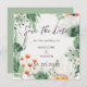 Ett modernt och vackert spara-till-datum-kort för blommigt med en underbar design av vildblommans vattenfärg och ett vitt, grönt och orange färg-schema, som accentueras av ett kalligrafteckensnitt för contemporary för ett modernt men romantiskt utseende.