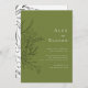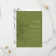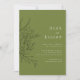 Modern, lekfull och ändå sofistikerad bröllopsinbjudan innehåller en hand plockade-bukett med blommigt parad med chic typografi i ett vackert naturligt grönt färg. Kontrasten mellan svart blommigt och grönt lägger till en extra kant av glamor.