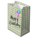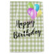 Sage grönt och white gingham check mönster med Grattis på födelsedagen text och ballongbukett. Text kan ändras eller tas bort. Storleka på gingham mönster kan ökas eller minskas.