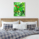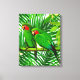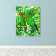 Canvas i ett illustration av ett tilltalande par grönt och röda papegojor på en bambusch mot bakgrund av djungelblad