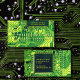Detaljerat fotografi av en pcb-tavla. Den tryckta kretsens huvudsakliga färg: grönt... Modern unica ett teckensnitt.