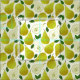 En mönster av pulserande gröntar i skuggor av gult och grönt med klara löv av grönt. Vissa päron halveras för att visa juikens insida och frön.