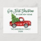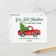 Moderna penselskript Vår första jul i vårt nya vykort för Flytta av hemmabruk innehåller Vintage av vattenfärg, röd Lastbil med Julgran - Grönt-skript för skog