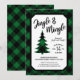 En festlig 'Jingle och Mingle' inbjudan till julfest med grön och svart buffalo-rutat ram och matchande träd-silhuett.