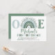 En roligt regnbåge första födelsedagsinbjudan med grönt-toner som är perfekt för en boho-regnbåge som kallas party för din lilla första födelsedag!
