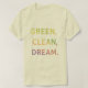 T-shirt-designen innehåller frasen "Grönt, Rengör, Dream" skriven i fetstil, brev med flera färgader med en skugga. Texten är centrerad på en solid ljusblå bakgrund som skapar en vibrerande och synlig sammansättning. Utformningen förmedlar ett budskap om miljömedvetenhet och ett hoppfullt perspektiv på en hållbar framtid.