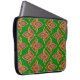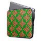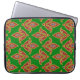 En snyggt på 15 tum laptop sleeve, med en "fleur-de-lys"-mönster i djup röd och guld i mörk grönt bakgrund, med en svart trim.