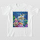 Silke målning av en grönt havssköldpadda och vänner. Små fiskar från guld, ängelfiskar och andra havet med färgade sjögräs och koraller. Roligt och ljus för akvarier, presentbutiker, gåvor och kort.