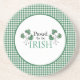 En Round Sandstone Underlägg, med grönt Shamrock löv och "Proud to be Irish" i keltiska skript, på en vit bakgrund med en Check Gingham gräns. En del av Posh & Painterly 'Shamrocks'-samlingen.