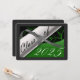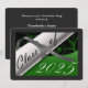 Grönt och silver studenten-kort med ett examensbevis och studenten-år. Baksidan är en grått-bakgrund med vita bokstäver för studentfestens inbjudningar.