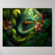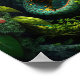 Grönt orm illustrerad i grenar i träd, omgiven av tropiska blommor av typ v1ibrant i en tropisk regnskog.