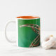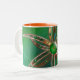 En abstrakt arbetar i grönt och koppar. En tydlig grönt är omgiven av kopparkanta blad av gräs som är accentuerade med mousserande myggor och orange stjärnsprängningar. Vågar, kurvfraktioner i bakgrunden visas i djupare grönt, brunt och orange inuti kopparfilträdet i löv motivet.