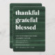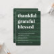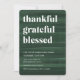Ge firande elegans och värme med den här Grönten tacksam gästinbjudan till gästfri Thanksgiving. Med en djup grönt texturerad bakgrund med djärv, vit typografi fångar denna moderna design tacksamhetsandan och tillsammans - skapar den perfekt för Thanksgiving dinners, Friendsgiving-sammankomster eller party hösten. Den meningsfulla trion ord - tack, tack och lov, välsignad - anger perfektens ton för en helgdag av hjärtfilt och snyggt. Anpassadet med dina detaljer gör den här inbjudan det lätt att välkomna nära nära till er bord. 5 x 7-tums utskriven inbjudan med rundade hörn Rik grönt med texturerad bakgrund med fet vit text Funktioner "Tack för tacksam välsignelse" i modern typografi Enkel att anpassa med dina middagsdetaljer Matchningshöljen tillgängliga