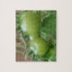 Det här fantastisk-pusslet är ett foto av en massa omogna körsbärstomater av grönt som odlas på en tomatfabrik i en förortsträdgård. Fotografiet togs med makrofotografi för ett detaljerat resultat.